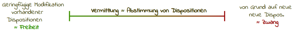 Da wir Vermittlung i.e.S. als Herstellen von Inklu, als Zueinander-passend-Machen von Dispositionen verstehen, gibt es nun grundsätzlich zwei Pole der Vermittlung, nämlich einmal, von den bereits vorhandenen Dispositionen auszugehen und diese durch möglichst geringfügige Modifikationen einander anzupassen, oder diese zu ignorieren und den Vermittelten von Grund auf neue Dispositionen aufzuerlegen. Von den bestehenden Dispositionen auszugehen, würde wohl eher dem Alltagsverständnis von Vermittlung entsprechen. Dem hier verwendeten Verständnis als jedem Akt, durch den von außen Verbindungen hergestellt und Dispositionen in Einklang gebracht werden, entspricht aber beides, es schließt also z.B. auch Machtstrukturen mit ein. Die Freiheit der Menschen hängt wesentlich davon ab, wieweit ihre bestehenden Dispositionen bei der Vermittlung berücksichtigt werden.